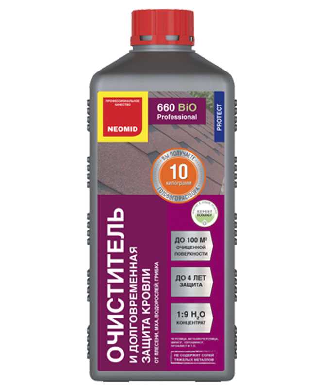 Средство NEOMID 660 Очиститель кровли концентрат 1:9 предназначено для удаления и подавления роста мха, плесени, грибков, водорослей, а также других биопоражений на любых видах мягкой и жесткой кровли (черепица, в том числе битумная, металлочерепица, шифер, еврошифер, профлист, штучный кровельный материал и т.п.).