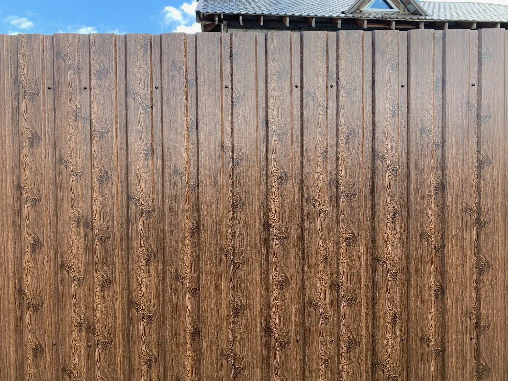 Текстурированная поверхность профлиста имитирует натуральное дерево, в данном случае - кедр. Это придает зданию эстетичный и привлекательный внешний вид.