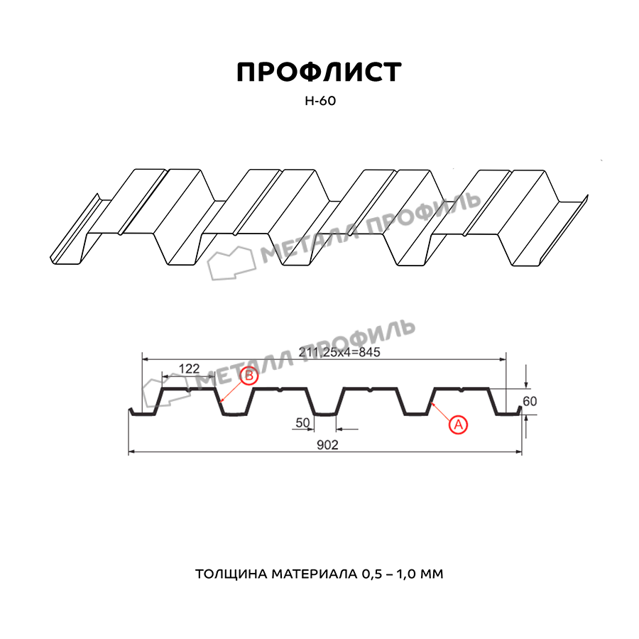Этот профлист изготовлен из высококачественного металла и имеет профиль Н-60. Толщина листа составляет 0,5 мм, что обеспечивает прочность и долговечность изделия.