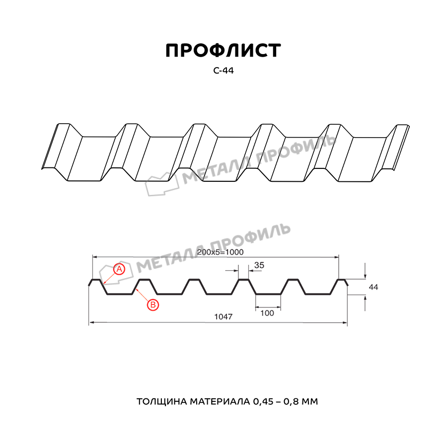 Профиль С-44 имеет трапециевидную форму и толщину 0,5 мм, что обеспечивает прочность и долговечность конструкции.